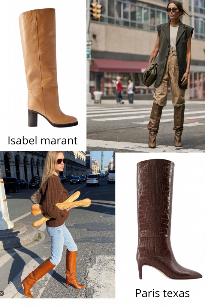J’ai gardé la tendance la plus pointue pour la fin (bon, la botte plissée en est une aussi) aka la botte bien large sur le mollet (là je crois que sans aucun doute je rentre mon jean à l’intérieur, je peux même y mettre mon chien) et petit talon ou épais comme les Isabel Marant et encore plus forte si elle est en cuir métallisé rose, violette, gold, fushia (Paris Texas / Essentiel Antwerp)
