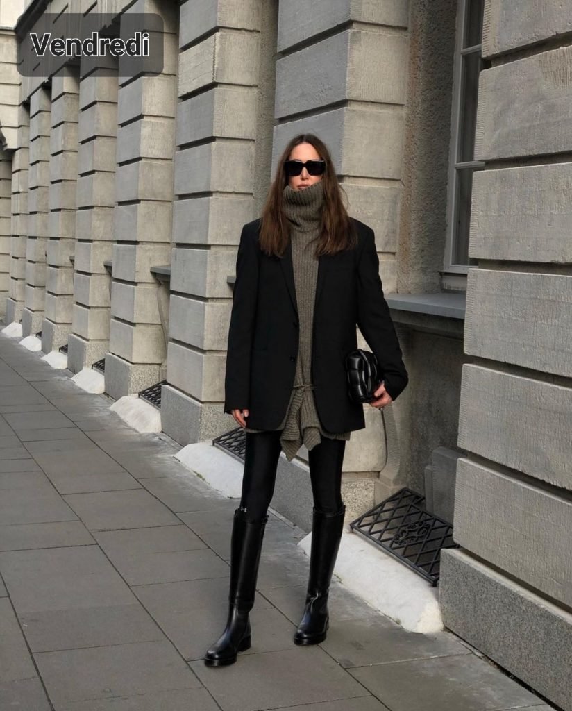 Le vendredi, une robe pull mais courte (elle peut être un peu plus longue que ça quand même) ou un très long pull, avec un legging en lainage ou comme ici bien opaque il n’y a rien d’impudique, un blazer suffisamment oversize pour contenir le volume de la maille et des bottes cavalières. Note à moi-même puisque j’ai les mêmes (des Ann Demeleumeester)