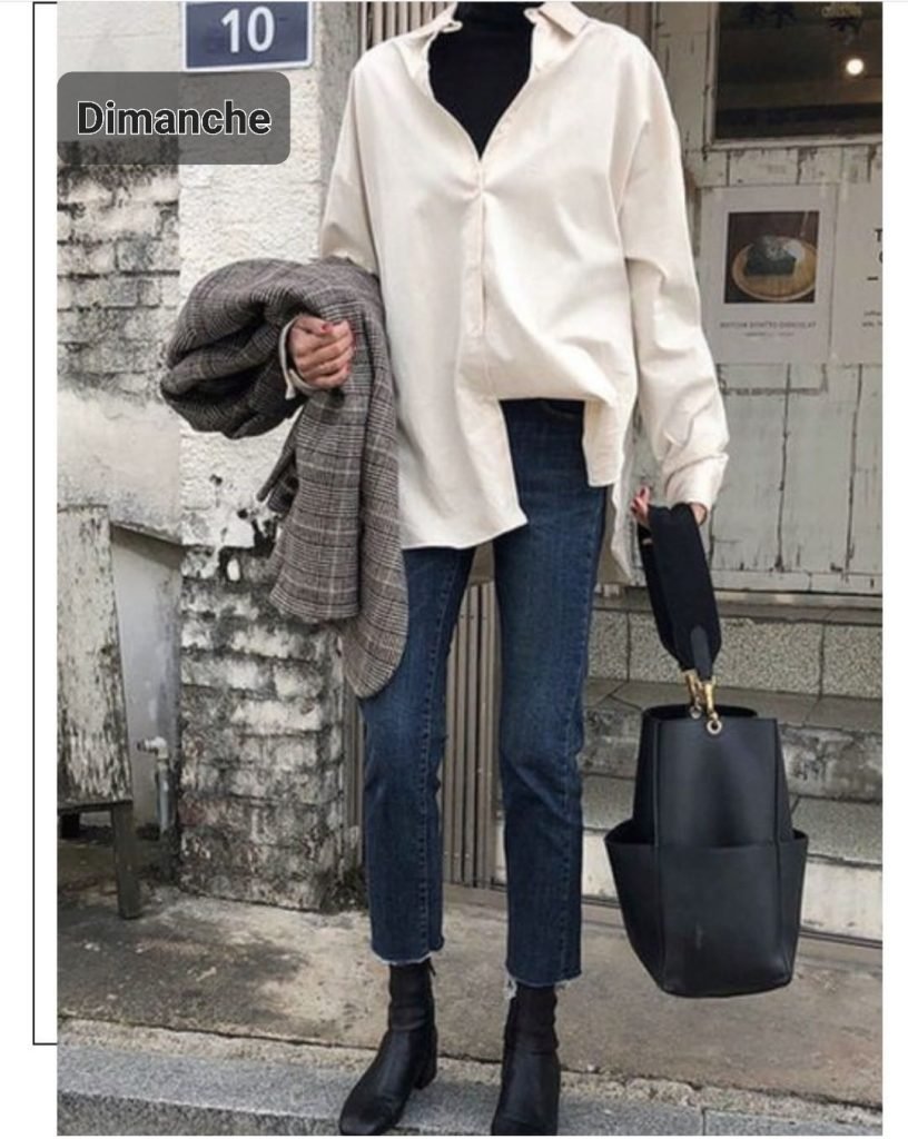 Dimanche, déjeuner en famille, on fait quand même un petit effort, on va pas se pointer en jog. Sous pull col roulé sous chemise ample glissée en partie dans un jean fitté, mum ou boyfriend mais 7/8 avec des boots confortables mais délicates, galbées sur la cheville. Re blazer mais pas blasée et ce même si ce dej est dans la belle famille hé hé – et avec ça un bon grand gros sac qui commence doucement à faire son come back. C’est toujours comme ça les alternances entre extrêmes.
