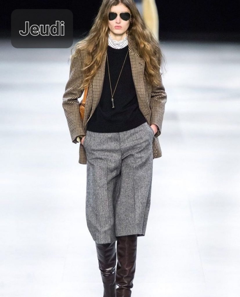 Le jeudi, c’est la femme Celine. Heidi Slimane est tout de même bien balèze dans ses propositions de vestiaires transposables à la vraie vie, sans être griffés même si il n’invente rien on est d’accord, mais il a du flair. Une élégance rétro tout en étant intemporelle voilà le bon alliage. Toutes ces pièces on les a déjà vues différemment agencées dans ces différents cahiers de style. Le bermuda était en jean et il fera très bien l’affaire, la petite blouse d’été au col froufrou se glissera sous un pull col rond (celui-là il est déjà tout bouloché à la fréquence où on le porte ah ah), le blazer en tweed fait sa sortie de la semaine et avec ça on ressort nos vieilles bottes au look seventies parce qu’elles aussi sont éternelles.