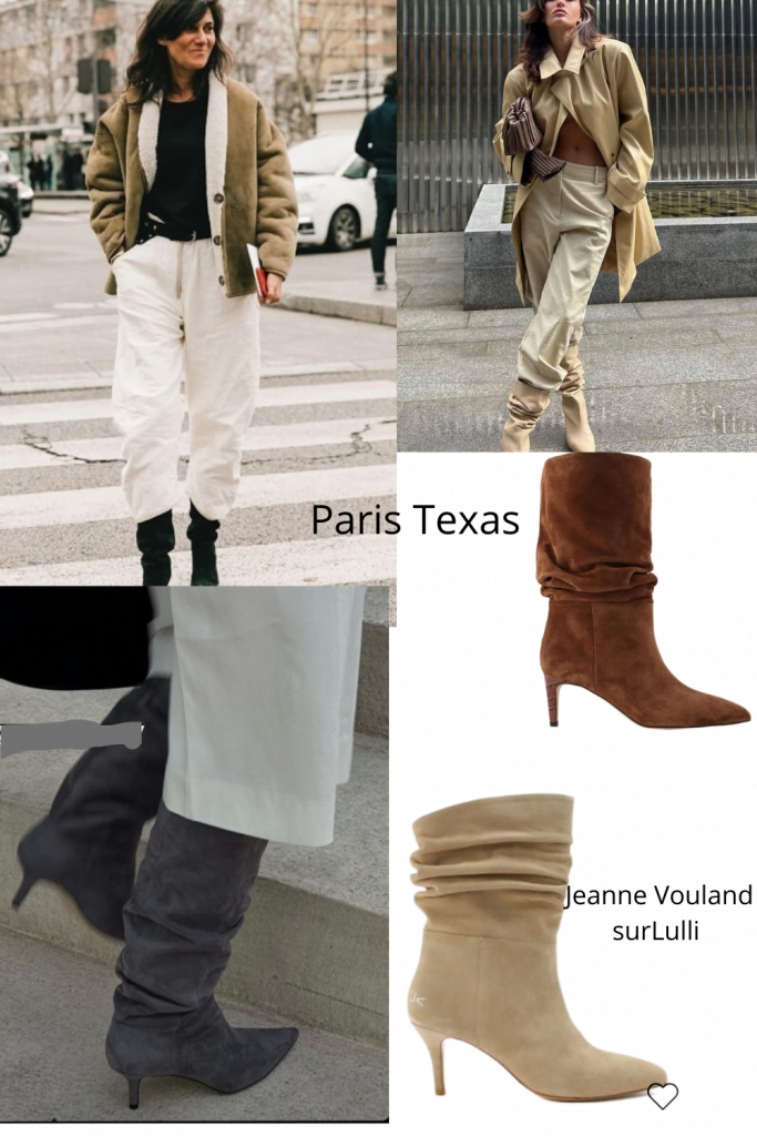 Cette fois ce sont les 80’s qu’on revisite avec ces bottes plissées – j’avais ça à 15 ans avec un talon un peu plus épais, je les adorais – Bah oui c’est le grand retour du pantalon DANS les bottes donc les bottes plissées sont parfaites pour ça. Moi ça fait juste 2 ans que je cherche des bottes dans lesquelles glisser mon fute mais comme je fais du 36, la tige est donc proportionnée à la taille et je n’ai pas des mollets de coq donc ça ne passe pas. J’ai de sacrés problèmes quand même dans ma vie ! ah ah