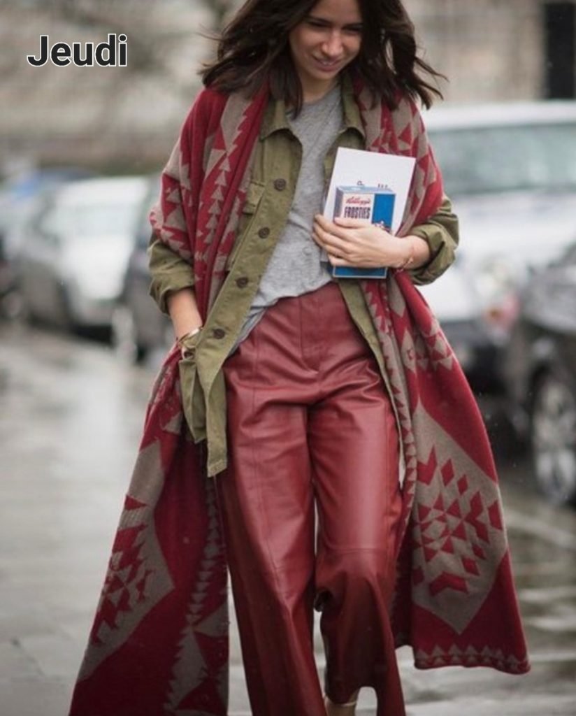 Le jeudi, on sort le cuir ou simili (le faux cuir est aujourd’hui tout à fait convenable) mais dans une couleur chaude. On attrape un sweat et sa vieille veste militaire et on enfile par dessus un manteau à l’esprit ethnique – genre le manteau burnou berbère à grosses rayures, voyez le genre. Isabel Marant en fait chaque année dans cet esprit ou un poncho si vous avez ou encore comme ici une gigantesque étole en guise de manteau – des boots et voilà.