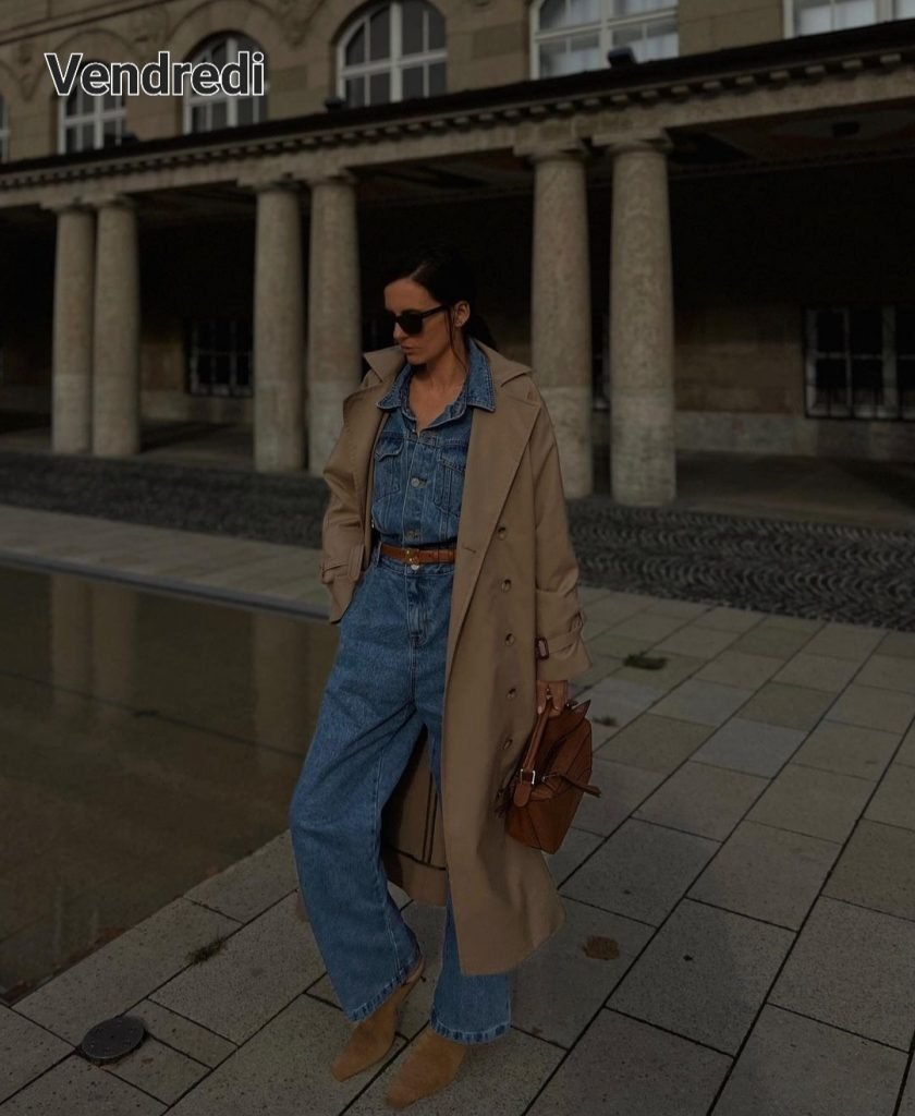 Le vendredi, c’est friday wear, alors on opte pour un total look en jean, qu’on a déjà vu ici dans le spécial jean. Faites comme vous voulez, une combi, un jean droit + une chemise ou une veste en jean, une ceinture pour accessoiriser, des boots en daim sable (celles qui n’ont plus d’âge), un trench ou un manteau long et un joli sac qui viendra féminiser le look.