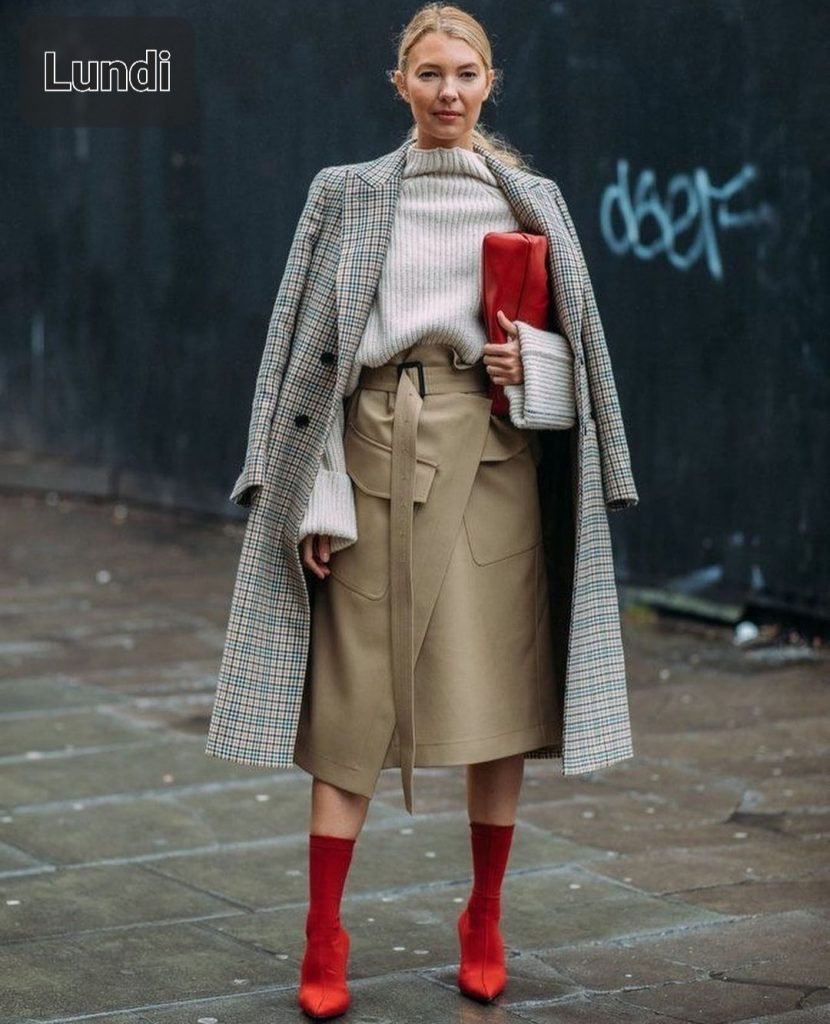 Le lundi, c’est la jupe midi cargo. Oui le style cargo se décline sur tout et nawak depuis le printemps – un style entre le vêtement de travail et la sape militaire, en gros une fringue avec de grosses poches pour y foutre ta boîte à outil et pis c’est tout – mais là c’est très réussi et féminin, j’imagine une jupe Burberry – on y glisse un pull douillet à l’intérieur, on ajoute un petit pardessus et on ressort les boots chaussettes d’il y quelques saisons.
