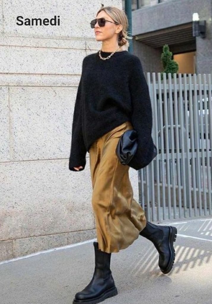 Samedi la slip skirt est de sortie – elle a déjà quelques saisons au compteur alors c’est possible que vous en aillez une – avec des collants chauds en dessous ça passe, un bon gros pull et des chelsea boots à grosses semelles, qu’on remplacera par des bottes à talons pour le soir ou pas – on rajoute un manteau enveloppant par dessus pour passer des courses au dîner chez les potes.
