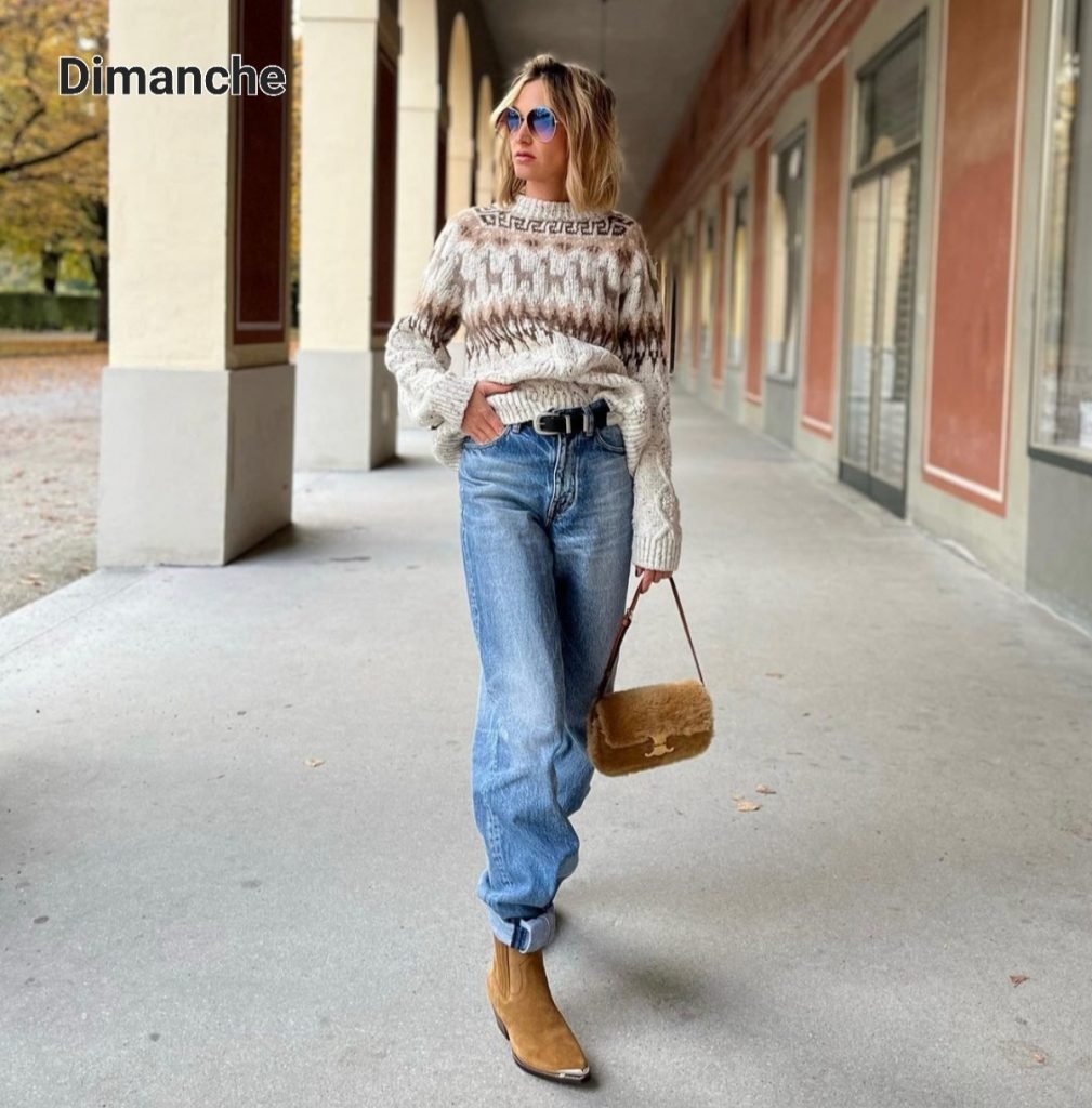 Le dimanche c’est toujours à la cool. Un jean mum, les boots du vendredi, un pull norvégien pour changer. Par dessus, une veste paletot, un caban, un bomber, une veste en tweed, c’est comme vous voulez.
