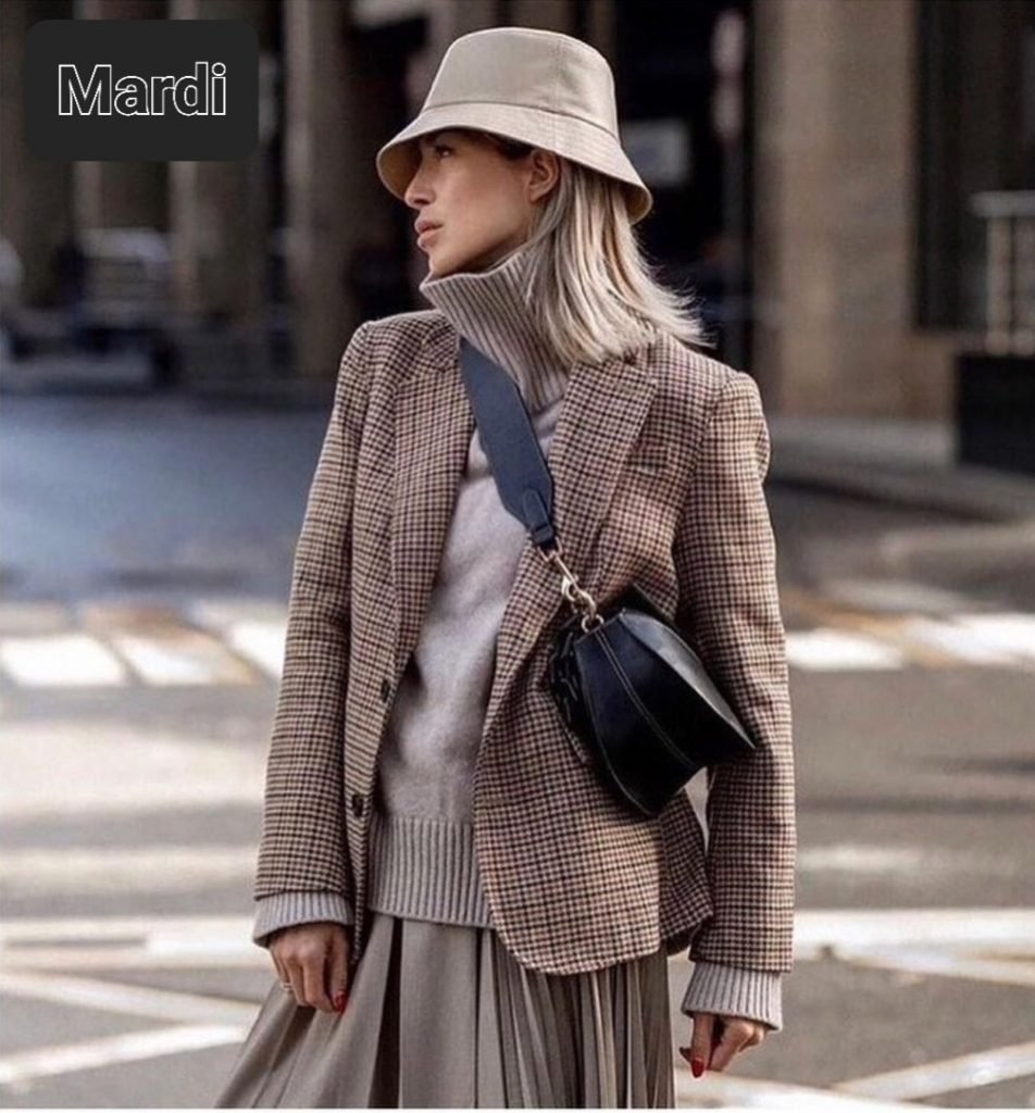 Le jeu des 3 couleurs qui matchent bien ensemble. Un pantalon à pinces, un col roulé, un paletot. J’enlèverai le côté précieux en changeant le sac par un sac en bandoulière et je rajouterai une ceinture.