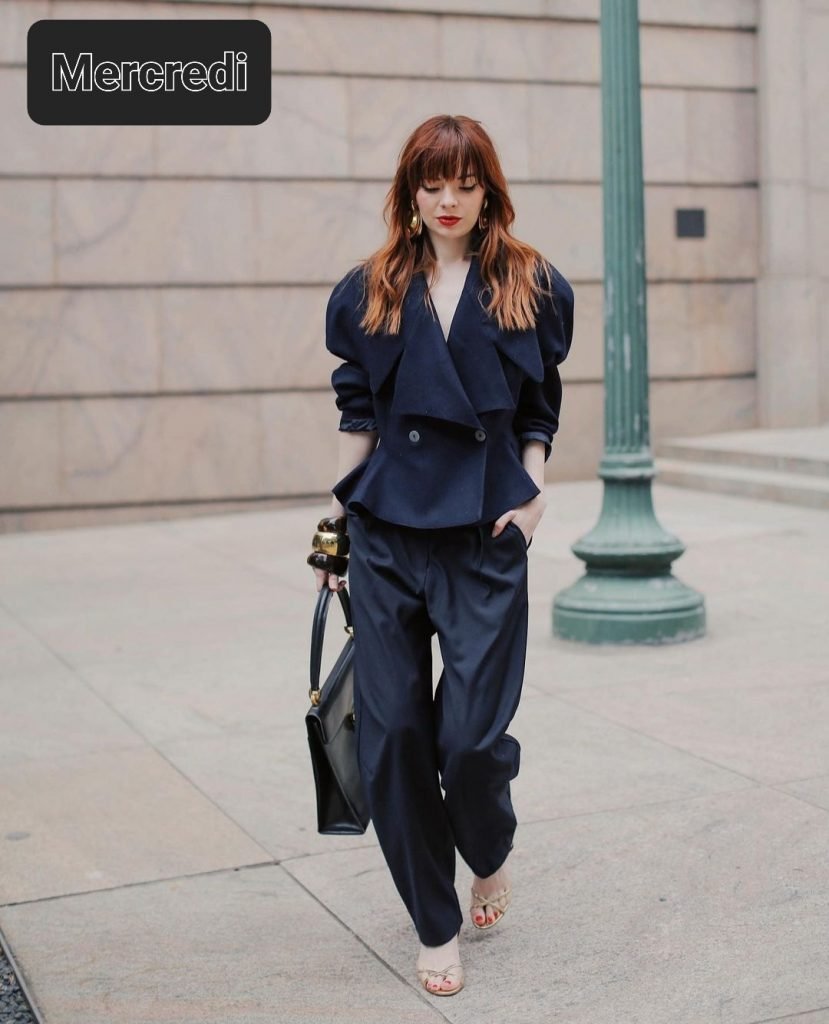 Cette photo est dans mon tel depuis très très longtemps. J’adore la dégaine de ce tailleur, la veste à basque, les épaules rondes, le large revers du col, la coupe du fute. Très certainement un ensemble vintage (la passion de cette jeune femme). Évidemment les sandales seront remplacées par des boots. Comme il est tout à fait improbable de posséder une telle veste, une version veste col châle ceinturée fera l’affaire (voir page shopping).