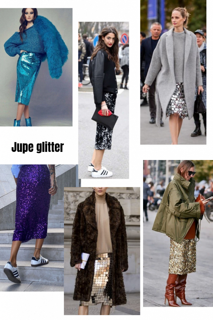 Ce qui compte avant tout, c’est de se sentir bien dans sa tenue. L’air pétrifié n’est jamais chic. Et pas besoin non plus de se la jouer glamour à donf, au contraire, le glitter nécessite de la nonchalance. Une mini robe avec des chaussures plates, c’est cool. Le traitement funky du sequin aussi. On porte la jupe ou le fute avec un tee-shirt, une chemise ou un col roulé fin.