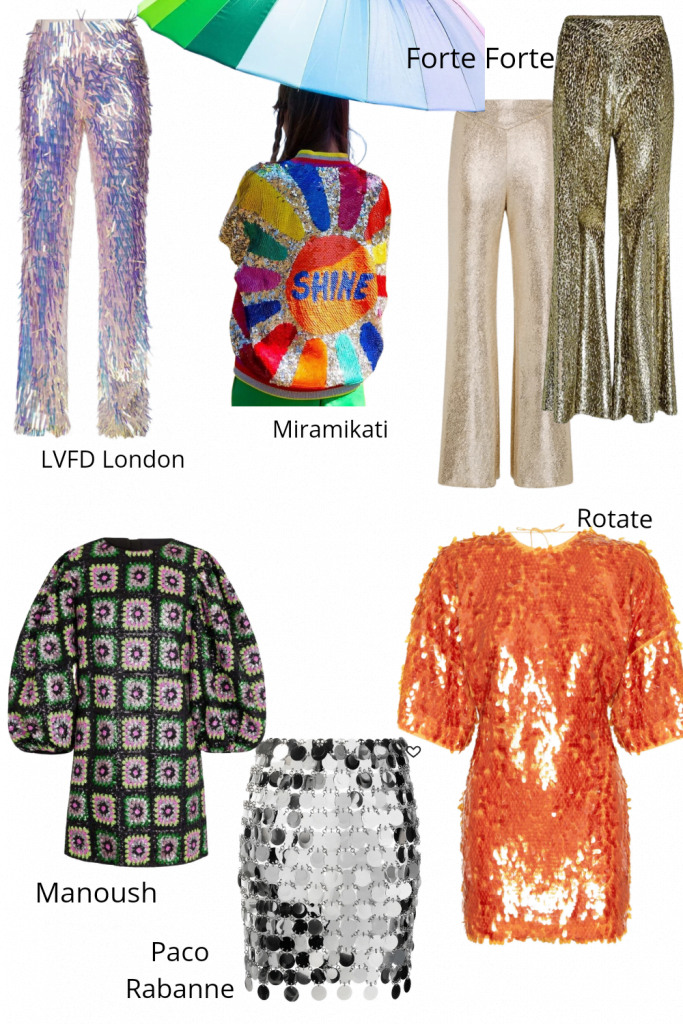 L’histoire nous a montré que plus les périodes étaient troublées plus les peuples se noyaient dans la fête, à voir le dress code qu’on nous propose pour cette fin d’année, c’est peu de le dire qu’on est dans la merde internationale. C’est une avalanche de sequins, de glitter, de lamé, de lurex, sortez les lunettes au risque de vous cramer la rétine. Mais cette année le tout ce qui brille est plutôt canon, alors pourquoi se priver de jouer à la princesse d’un soir ? En revanche n’investissez pas exprès pour l’occase alors que vous cogitiez depuis des semaines sur la rentabilité d’un nouveau manteau. Un certain nombre de femmes attendent la bonne justification pour s’autoriser un achat – un anniversaire, un mariage, une fête quelconque – sans doute par culpabilité alors même que ces achats « festifs » se révéleront totalement inutiles au quotidien. A moins que ce ne soit une réminiscence puérile de l’enfance « la tenue de rentrée » « la 1ere boum » ou encore cette névrose très féminine de la comparaison. Perso, je ne souviens pas avoir acheter spécialement une fringue pour une soirée, un mariage ou les fêtes de fin d’année, à part pour mes 40 et 50 ans. Je shoppe dans mon dressing encore une fois. Ça ne m’empêche pas d’acheter des pièces glitter quand ça me prend mais pas pour une occasion particulière. Je me dis que je les porterais quand l’envie m’en prendra. En pratique, elles restent le plus souvent conscrites aux soirées.