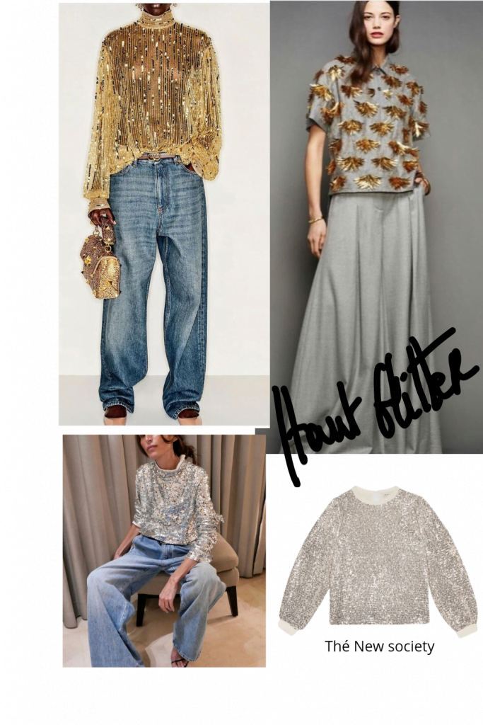 Le top glitter sera sans doute le plus facile à REporter – avec un pantalon large et des talons, c’est le combo zéro risque, que du bonus.