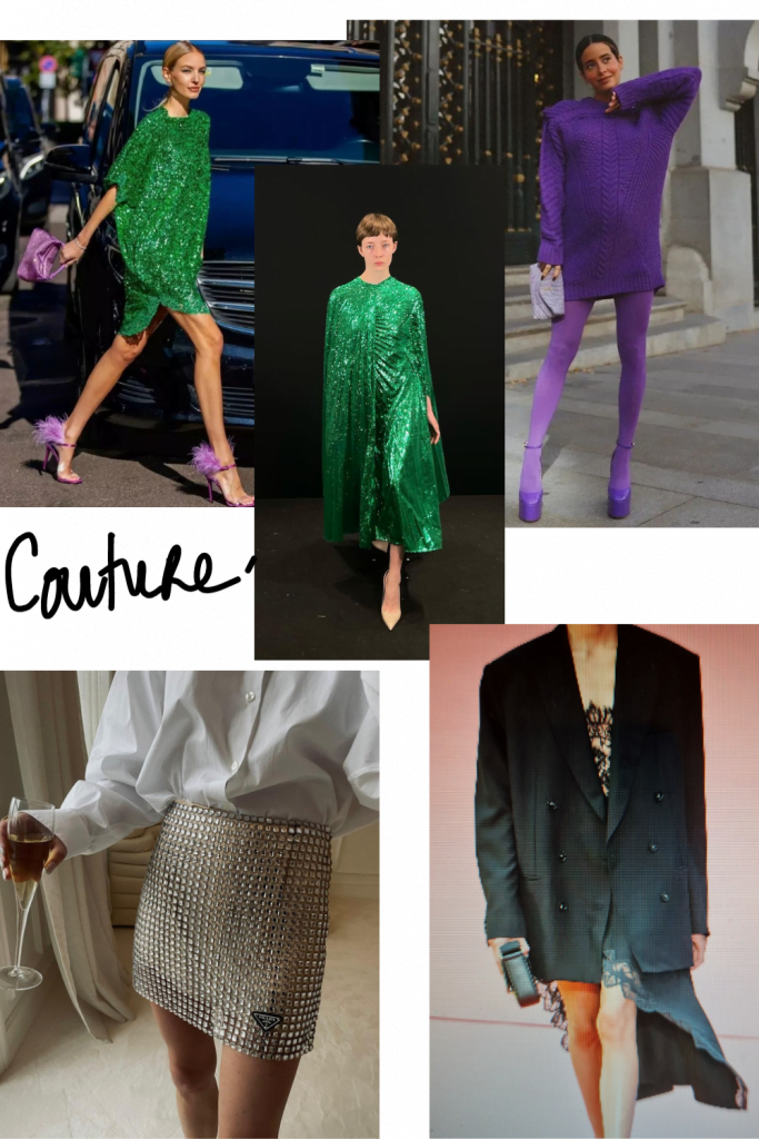 Et parce qu’il n’y a pas que les paillettes dans la nuit, y’a les froufrous, les dentelles, les velours, les brocards, les satins, les volumes extravagants, il y a mille possibilités d’improviser une tenue de soirée avec ce qu’on a dans l’armoire, il suffit d’appréhender vos pièces autrement. Le costume en velours se portera sans rien en dessous (enfin un top en soie quand même), le fute d’homme avec un body transparent manches longues et un bustier en matière brut , la longue chemise en mini robe, le legging funky avec une veste smoking, voyez le genre.