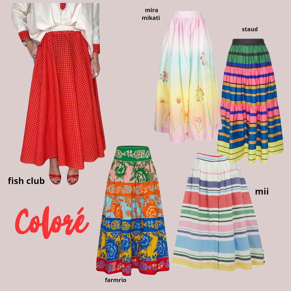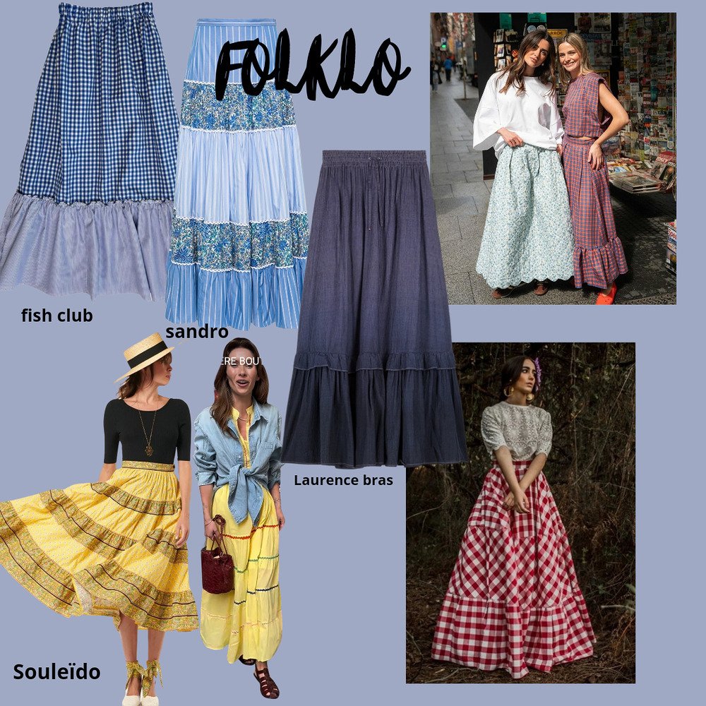 Qui l’eut cru ? Le jupon folklo que l’on n’avait pas vu, si je ne me trompe pas, depuis les années 80′ revient, avec à sa tête, le jupon provençal. Souvenez-vous du raz de marée Souleïdo ! J’en avais déniché un magnifique, pour le « shoppé pour vous » de la boutique que finalement je pensais garder (le danger de cet exercice), une copine est passé par là et me l’a braqué direct, c’est tellement son style que je ne pouvais pas lui refuser. Pour enfoncer le clou, le Bon Marché leur consacre tout l’espace central du 1er étage. Donc ce jupon folklo a des airs enfantins, des petits volants, des petits croquets, il est chou et nous transporte dans le Sud en moins de 2. Pour casser ce côté naïf, on lui adjoint du brut, comme du jean, du coton épais, des sneakers, des slip-on, des chaussures plus street, on modernise quoi sinon on se prend 10 ans dans le nez.